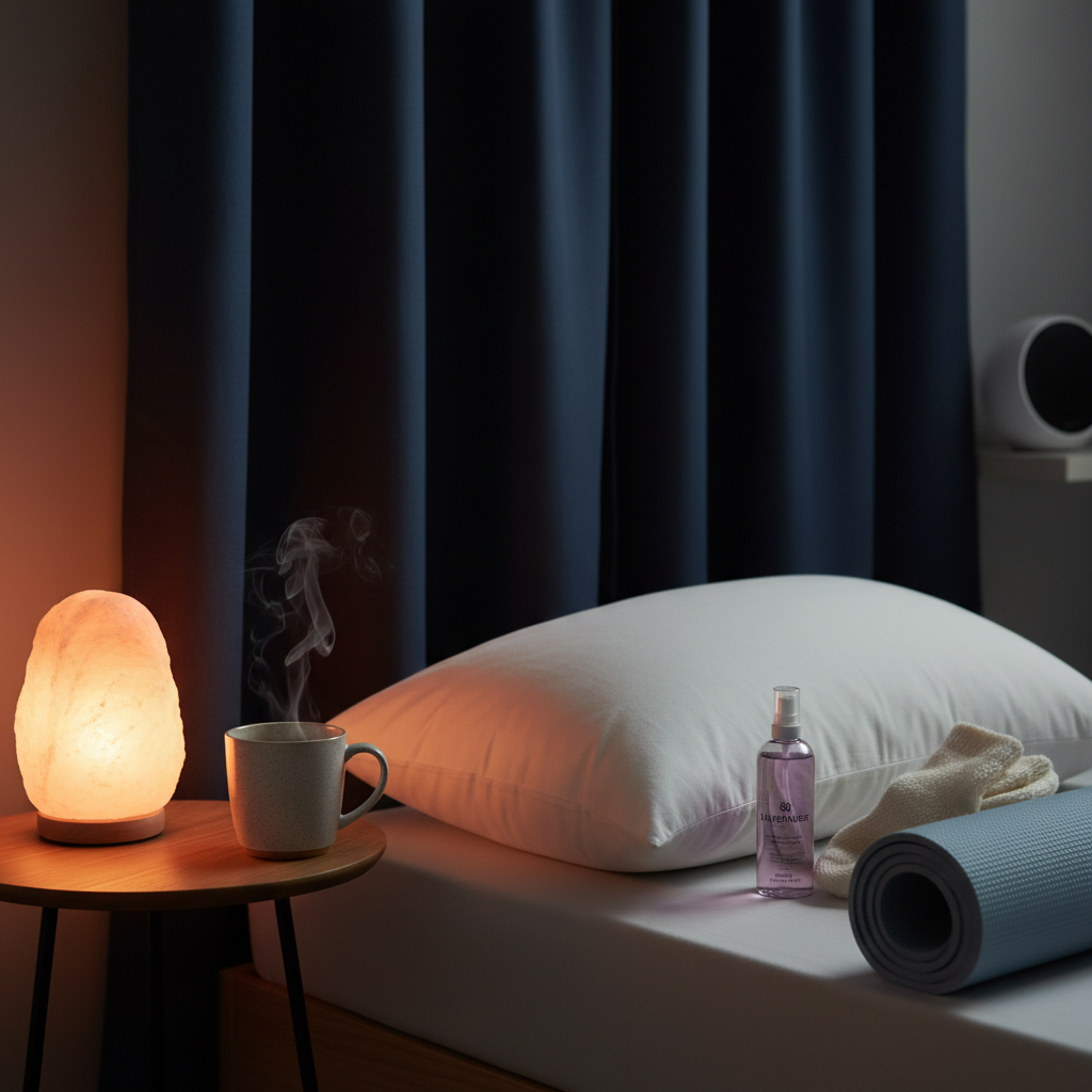 A peaceful nighttime bedroom environment with elements like lavender-scented pillow spray, blackout curtains, white noise machine, and a calm, cozy ambiance ready for restful sleep.