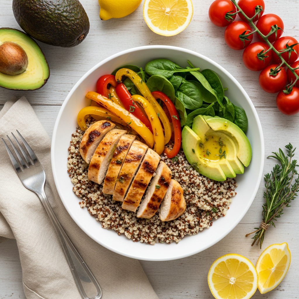 • Quinoa bowl with grilled chicken, roasted peppers, spinach, avocado, and lemon-olive oil drizzle — a flavorful and nutrient-packed option.