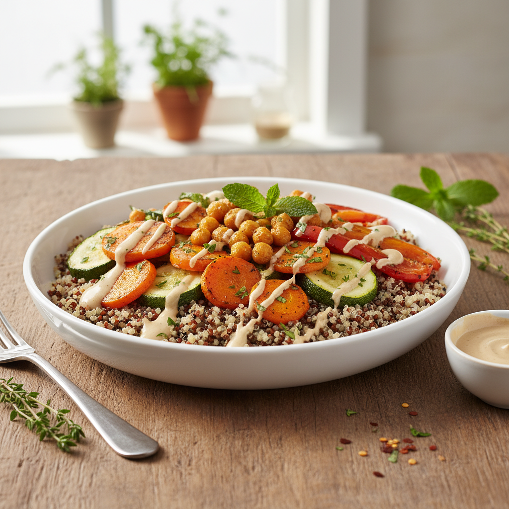 Enjoy a vibrant plate filled with quinoa cooked in flavorful vegetable broth, alongside roasted carrots, zucchini, bell peppers, and cumin-spiced chickpeas. Top with a refreshing tzatziki sauce or creamy tahini drizzle for an easy meal prep winner.