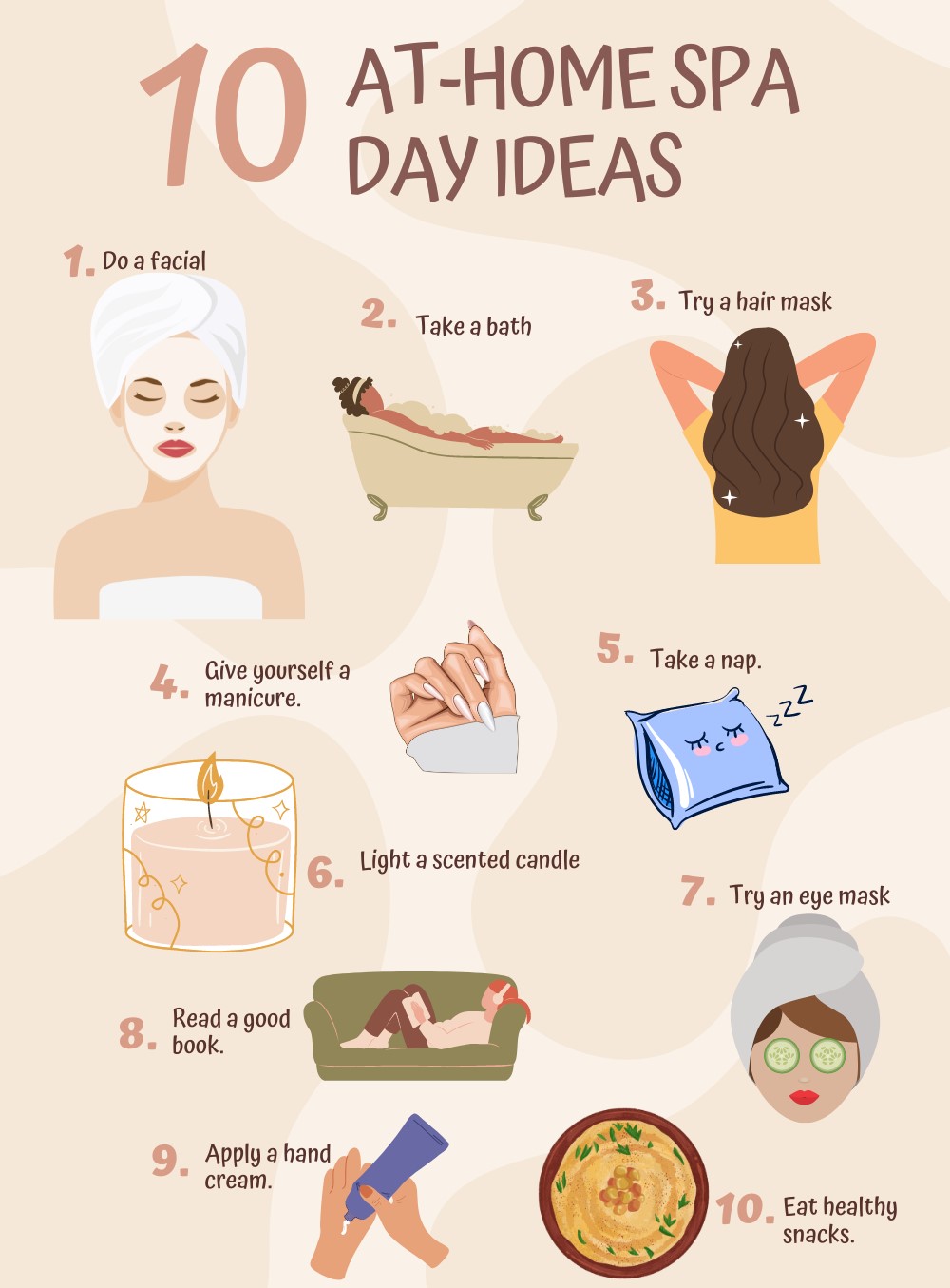 An at-home spa day is what it sounds like – a spa-like experience that you set up in your home. It can be as simple as applying a face mask or as elaborate as aromatherapy and a bath with face and hair masks and skincare rituals. Doing DIY spa activities is a form of self-care, which is a form of caring for your physical and mental health.